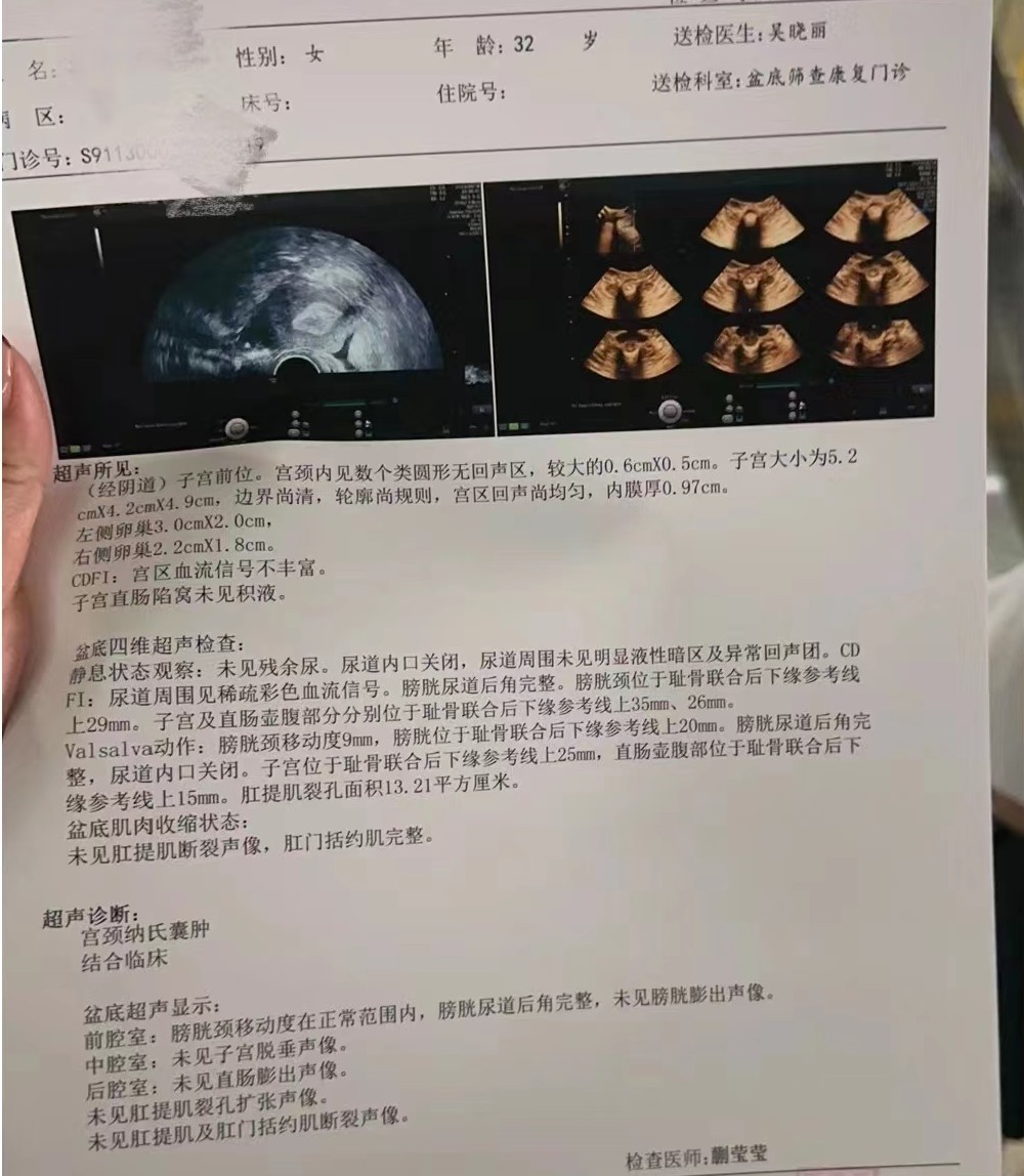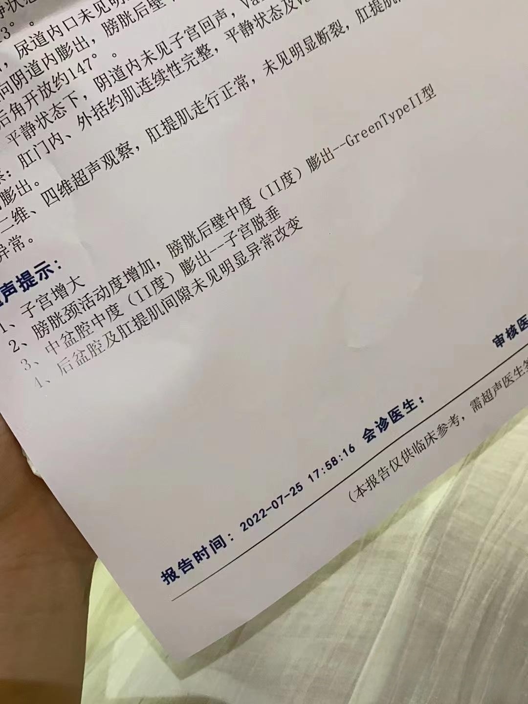 产后复查时查出盆底肌松弛了,筛查得分才只有40多分,当时没当回事就回家了,可有一天带着孩子在外面玩的时候,竟然尿裤子了,尿液顺着裤管流下来真是尴尬透顶,后来感觉下体坠胀的严重,腰背酸痛,竟然看到阴道口漏出一个肉疙瘩,刚开始还只有葡萄粒那么大,后来脱出的部分越来越大,上厕所都能看到宫颈漏出来,垂坠在腿间被磨得生疼,身上总是有股尿骚味,不敢走路,不敢出门,天天闷在家,时间长了夫妻性生活也受到很大的影响,感觉老公有点嫌弃虽然嘴上不说,我知道这样下去不是办法,如果我再不做出改变,这个家就得散了。